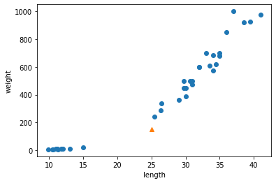 # 도미로 분류하는 것이 적절한 데이터를 예측을 진행 했으나 빙어로 분류했다 print(kn.predict([[25,150]])) # [0.] # 산점도 그래프를 출력, 데이터 확인 plt.scatter(train_input[:,0], train_input[:,1]) plt.scatter(25, 150, marker='^') plt.xlabel('length') plt.ylabel('weight') plt.show()