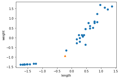 mean= np.mean(train_input, axis=0) std=np.std(train_input, axis=0) train_scaled = (train_input - mean) / std # 표준화 진행 new = ([25,150] - mean) / std # (25, 150) 데이터에 표준화 진행 plt.scatter(train_scaled[:,0], train_scaled[:,1]) plt.scatter(new[0], new[1], marker='^') plt.xlabel('length') plt.ylabel('weight') plt.show()