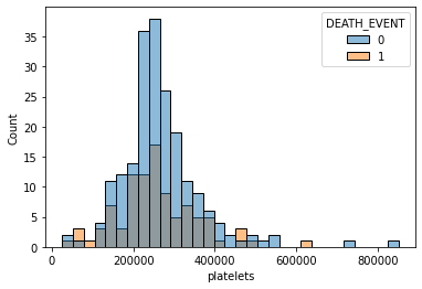 sns.histplot(x='platelets', data=df, hue='DEATH_EVENT')