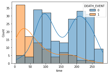 sns.histplot(x='time', data=df, hue='DEATH_EVENT', kde=True)