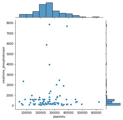 # Dataset의 데이터중 사망자 데이터만 이용 sns.jointplot(x='platelets', y='creatinine_phosphokinase', data=df[df['DEATH_EVENT'] == 1])