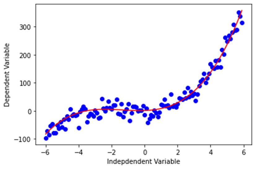 x = np.arange(-6.0, 6.0, 0.1) y = 1*(x**3) + 4*(x**2) + 2*x + 1 y_noise = 20 * np.random.normal(size=x.size) # x.size(120)개의 평균 0, 표준편차 1의 정규분포에 20을 곱한 오차 생성 ydata = y + y_noise # 데이터 생성 plt.plot(x, ydata, 'bo') plt.plot(x,y, 'r') plt.ylabel('Dependent Variable') plt.xlabel('Indepdendent Variable') plt.show()