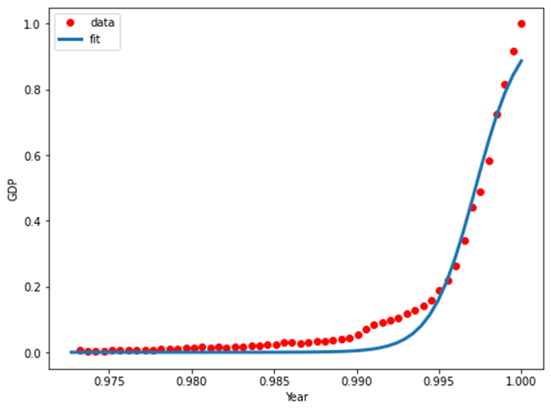 x = np.linspace(1960, 2015, 55) x = x/max(x) plt.figure(figsize=(8,5)) y = sigmoid(x, *popt) plt.plot(xdata, ydata, 'ro', label='data') plt.plot(x,y, linewidth=3.0, label='fit') plt.legend(loc='best') plt.ylabel('GDP') plt.xlabel('Year') plt.show()