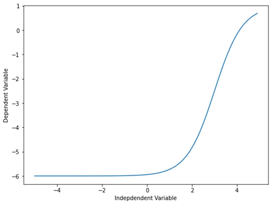 X = np.arange(-5.0, 5.0, 0.1) Y = 1-7/(1+np.power(5, X-3)) plt.figure(figsize=(8,6)) plt.plot(X,Y) plt.ylabel('Dependent Variable') plt.xlabel('Indepdendent Variable') plt.show()
