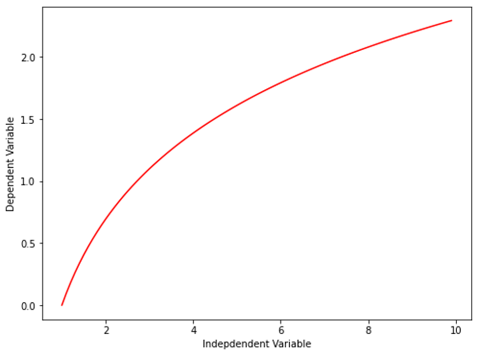 X = np.arange(1.0, 10.0, 0.1) Y = np.log(X) plt.figure(figsize=(8,6)) plt.plot(X,Y,’r’) plt.ylabel('Dependent Variable') plt.xlabel('Indepdendent Variable') plt.show()