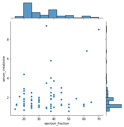 # Dataset의 데이터중 사망자 데이터만 이용 sns.jointplot(x='ejection_fraction', y='serum_creatinine', data=df[df['DEATH_EVENT'] == 1])