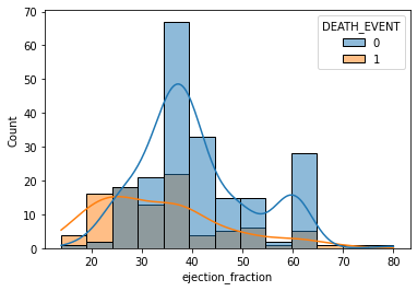 sns.histplot(x='ejection_fraction', data=df, bins=13, hue='DEATH_EVENT', kde=True)