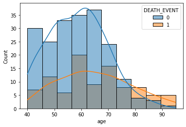 sns.histplot(x='age', data=df, hue='DEATH_EVENT', kde=True)