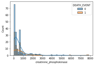 sns.histplot(x='creatinine_phosphokinase',data=df, hue='DEATH_EVENT',kde=True)