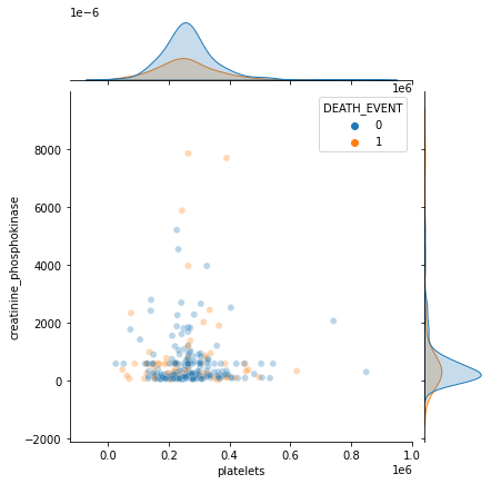 sns.jointplot(x='platelets', y='creatinine_phosphokinase', hue='DEATH_EVENT', data=df, alpha=0.3)